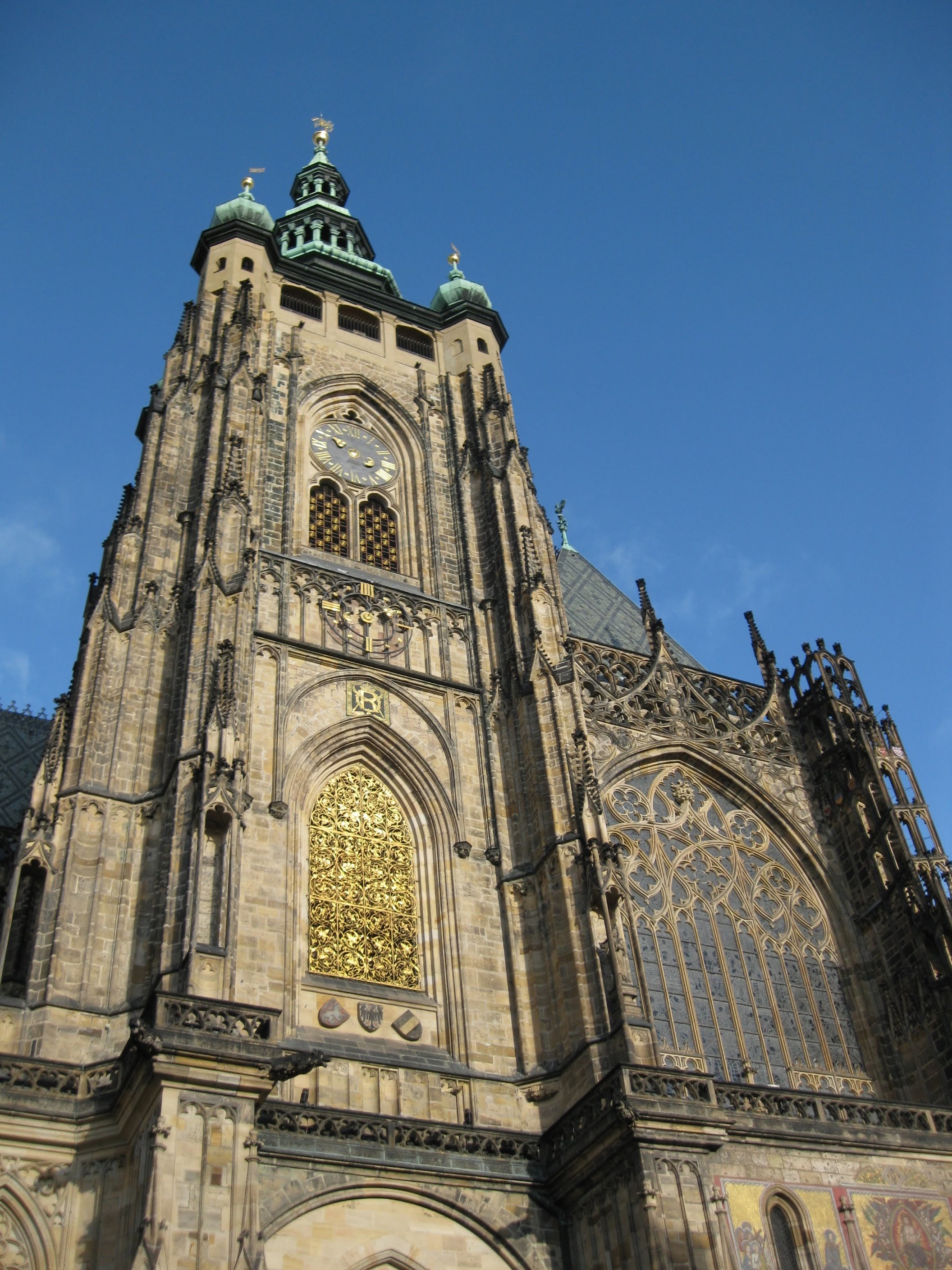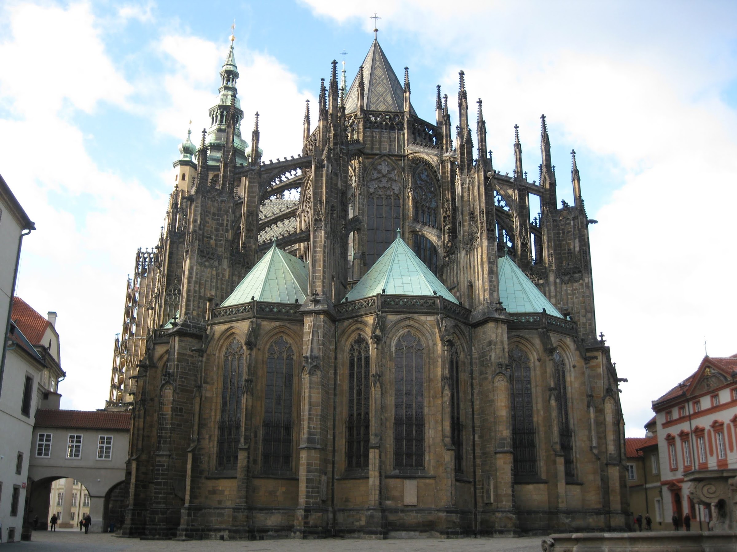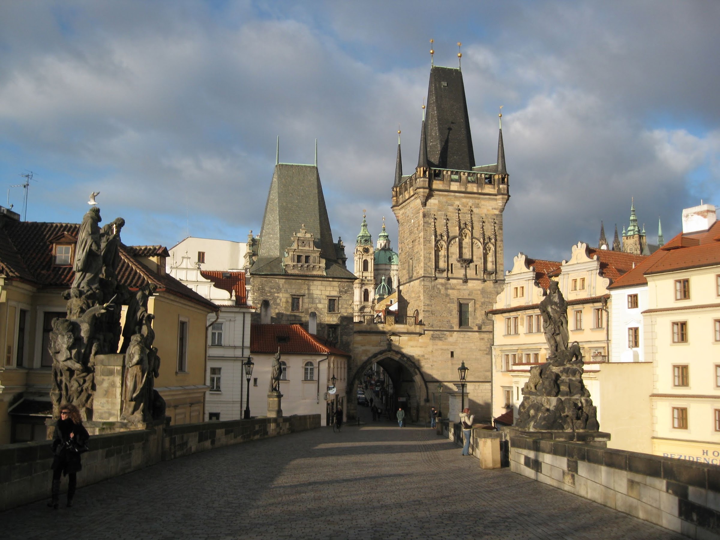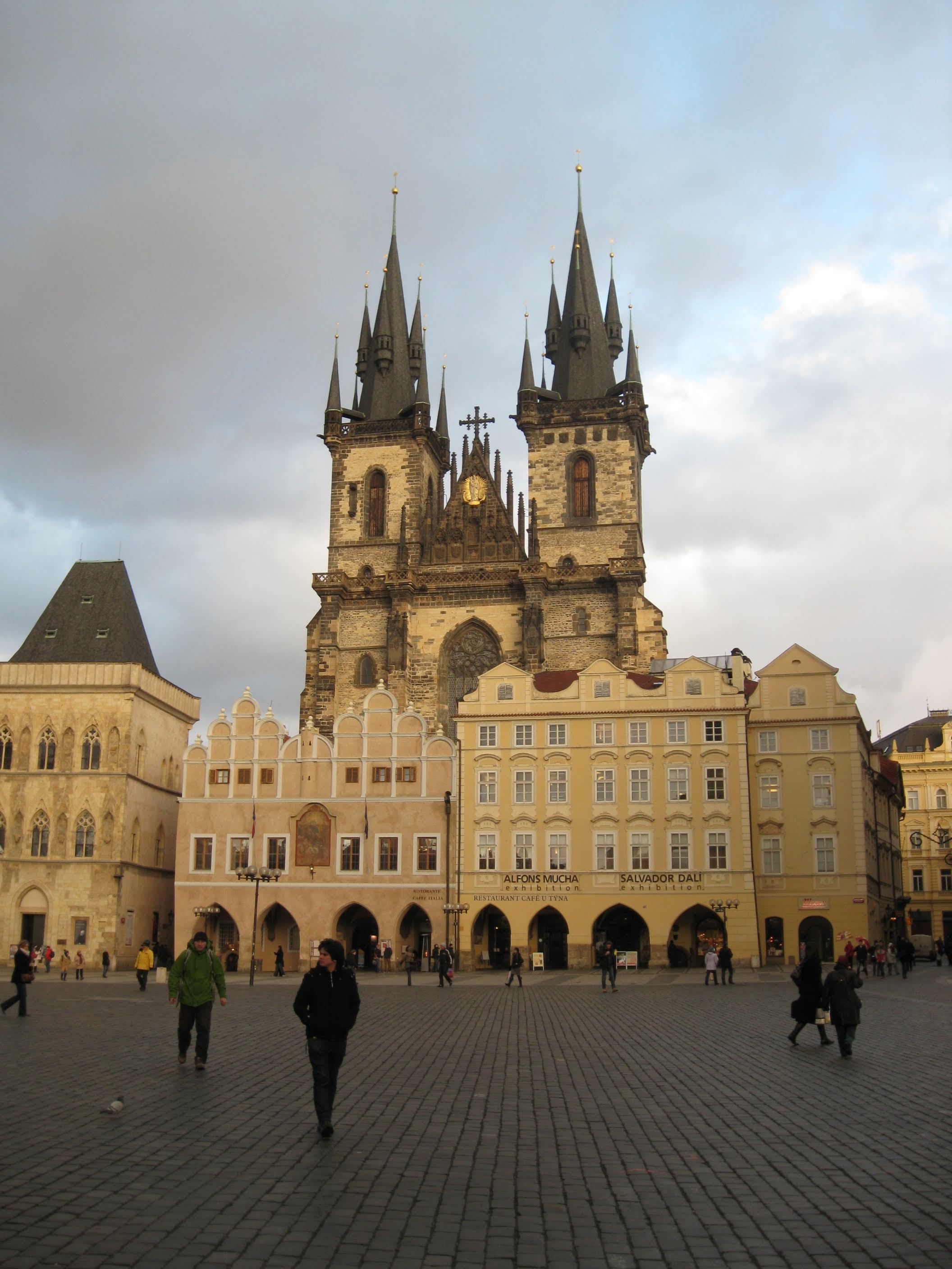 | In this photo, you can see what's left of the square today, as well as how all the buildings along the left side of the square have been replace by the Staromestska. The synagogue was sandwiched between the cathedral and the second building you see here from the right. |