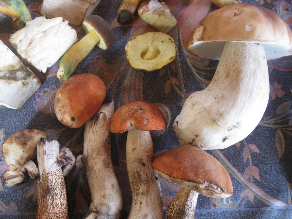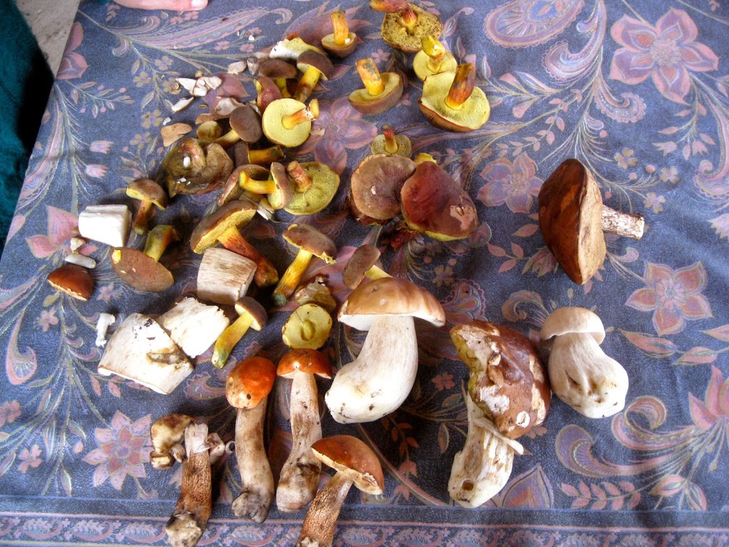 | The next morning's find: You've got some betle in the upper left corner, a bunch of suchohriby on the right and center, and a porcino that I found at the bottom, center. |