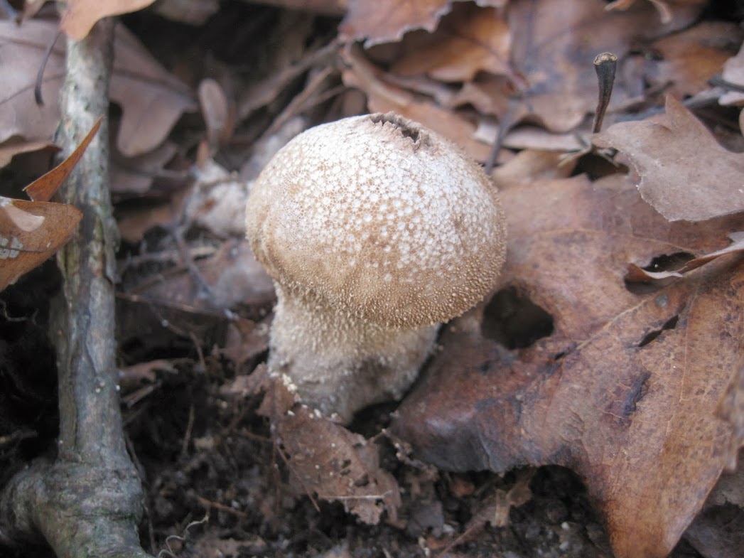 | This one releases a fine cloud of spores through its hole at the top when squeezed or poked. You can apparently eat these when they're young, but not when they're fully mature. |