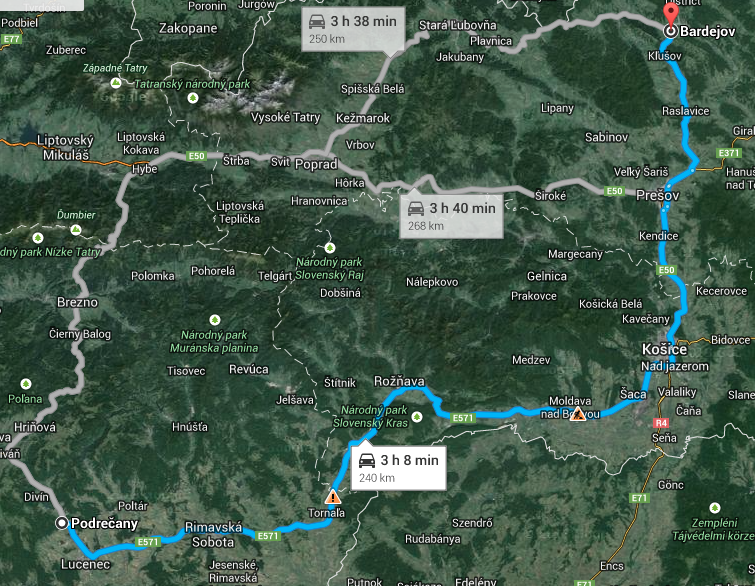The turnoff for Bardejov in Prešov is not clearly signposted at all. In fact, this was an all too common theme on our trip. Signage for many destinations in Slovakia is notoriously lacking. Usually the only sign for the turnoff you're looking for is right at the point where you need to turn, and you typically don't spot it until you're already passing it and it's too late to slow down and make the turn. These signs are seemingly never posted a block or so in advance, as they would be in California. It's also extremely common for these signs not to list what you'd think would be the most obvious towns or destinations along the given route, so you've really got to stay on your toes when navigating without a GPS, as we were doing.
