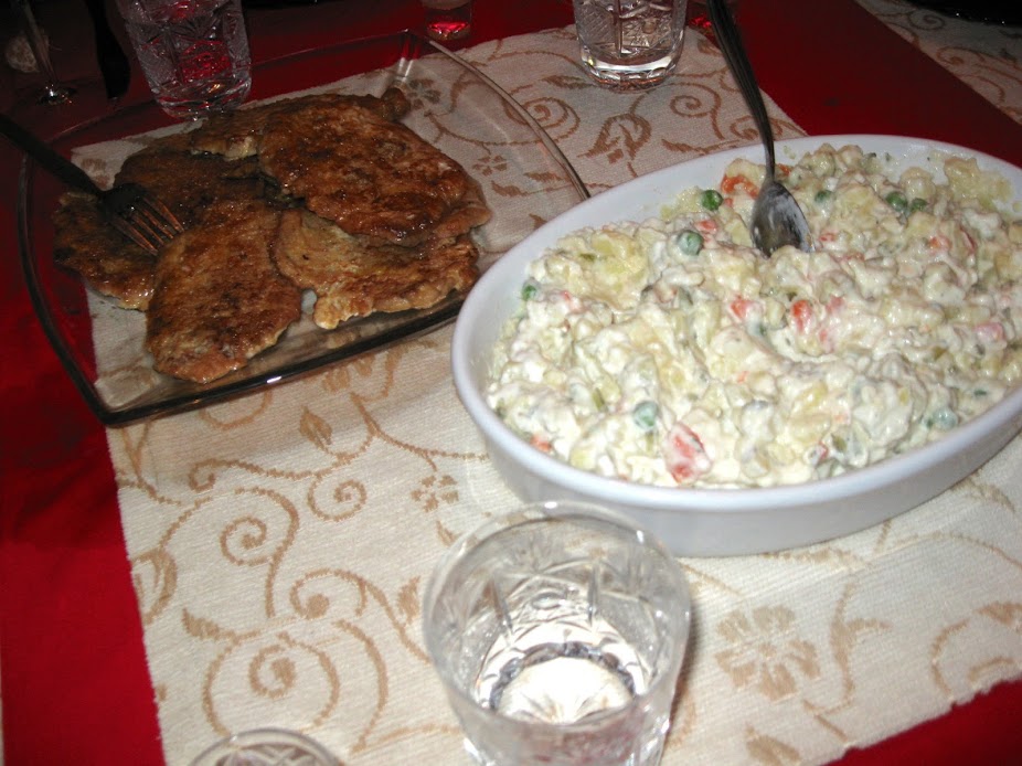 Next comes the main course, which if you're a hardcore catholic, involves mainly fish, because for some reason Catholics don't eat meat on Christmas Eve. As I mentioned earlier, the fish is often fried. However, it's not uncommon for there to be some pork schnitzel as well, and there's always a pile of it at Terezia's parents. But if Terezia's mom is feeling a bit more Catholic than usual, she won't eat any pork schnitzel until after midnight.