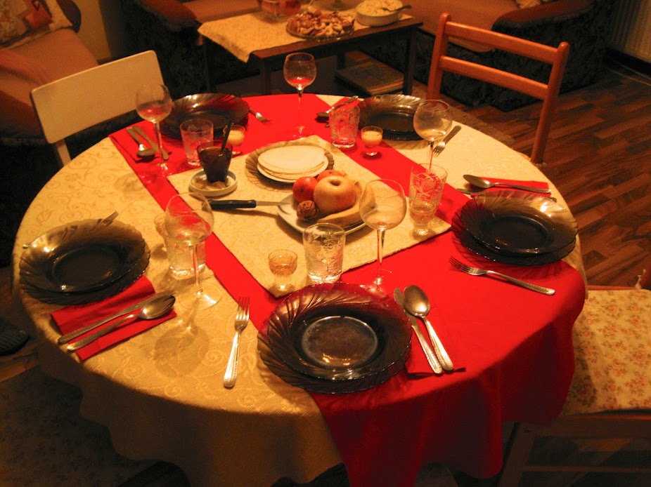 | Here's the Christmas table prior to eating. Notice the fruit in the center, which will be ritualistically sliced and distributed. |