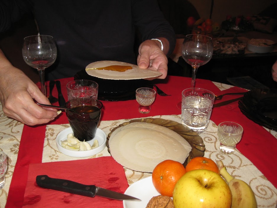 My favorite part of the ritual comes next. They bring out a plate stacked with oblatky, which are these flat, disk-shaped wafers, usually about 7" in diameter, often with something Christmas-y, like a nativity scene, stamped onto them. Terezia's mom takes the oblatky and spoons honey on them and then places onto each one a raw clove of garlic. You take the wafer and break it in half, folding it over so that it's kind of like a honey and garlic sandwich, and then eat it. It sounds weird, but the combination of wafer, honey, and garlic is actually kind of fun. The wafer is supposed to somehow symbolize the body of Christ (such a morbid religion - hey, let's eat the body of Christ!), while the honey and garlic, once again, are meant to ensure good health.