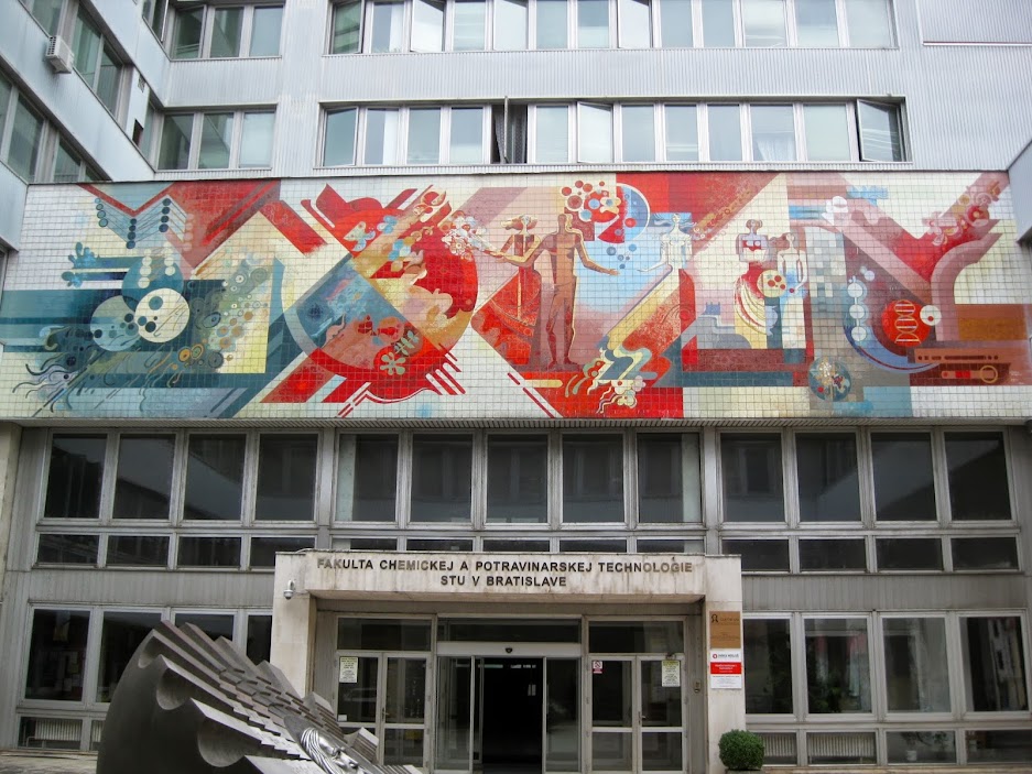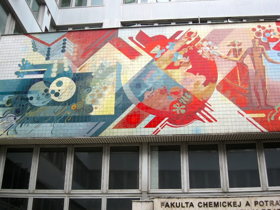 This is my new favorite commie mural in Bratislava, and it's located in a courtyard of the otherwise fairly drab technical university, right by the corner of Radlinského ulica and Jánska. I've walked by here numerous times, but never bothered (or had any reason) to venture into the university. I'm not sure if I can really decipher it, but I love how it's kind of a crazy amalgam of styles: like a weird fusion of Kandinsky, constructivism (esp. Moholy-Nagy), a touch of Charley Harper, maybe a smidgen of Klimt, a wee bit of art deco, and a dab of 60s Yellow Submarine psychedelic pop art. I love it.