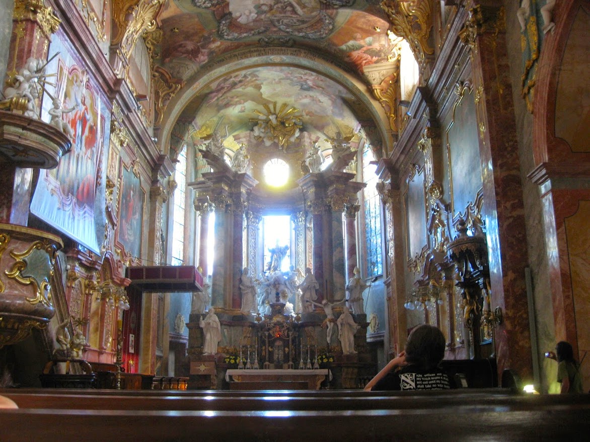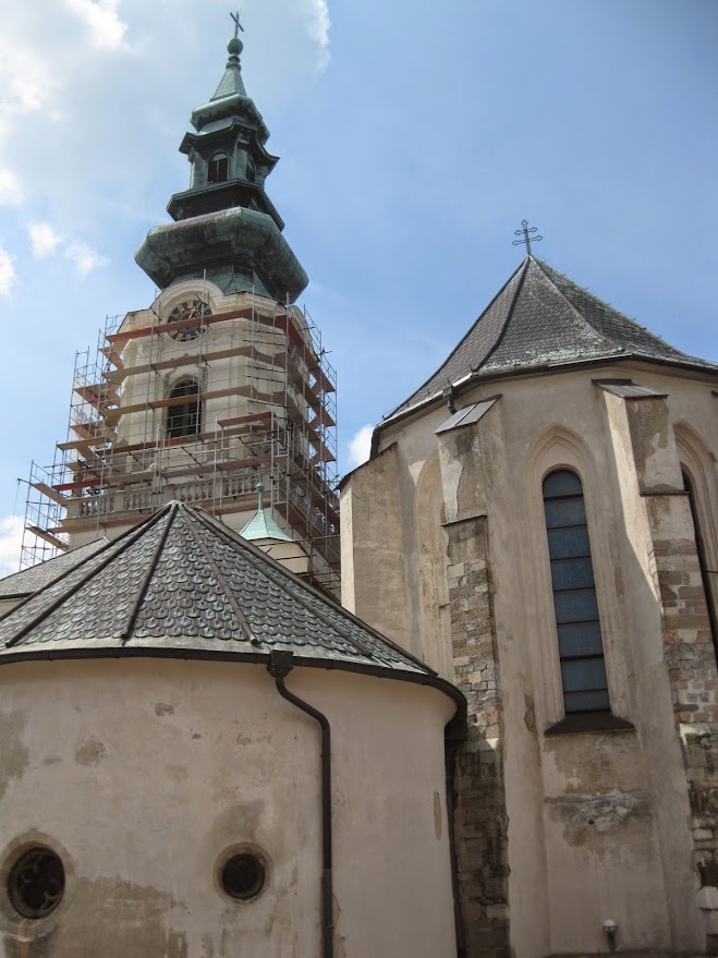 The church you see today was essentially built over two smaller churches, portions of which are still visible, and recent excavations have uncovered a possible fourth. The Baroque clock tower is extremely typical for central Europe. Sadly, it was covered in scaffolding when we were there - a photographer's worst nightmare.