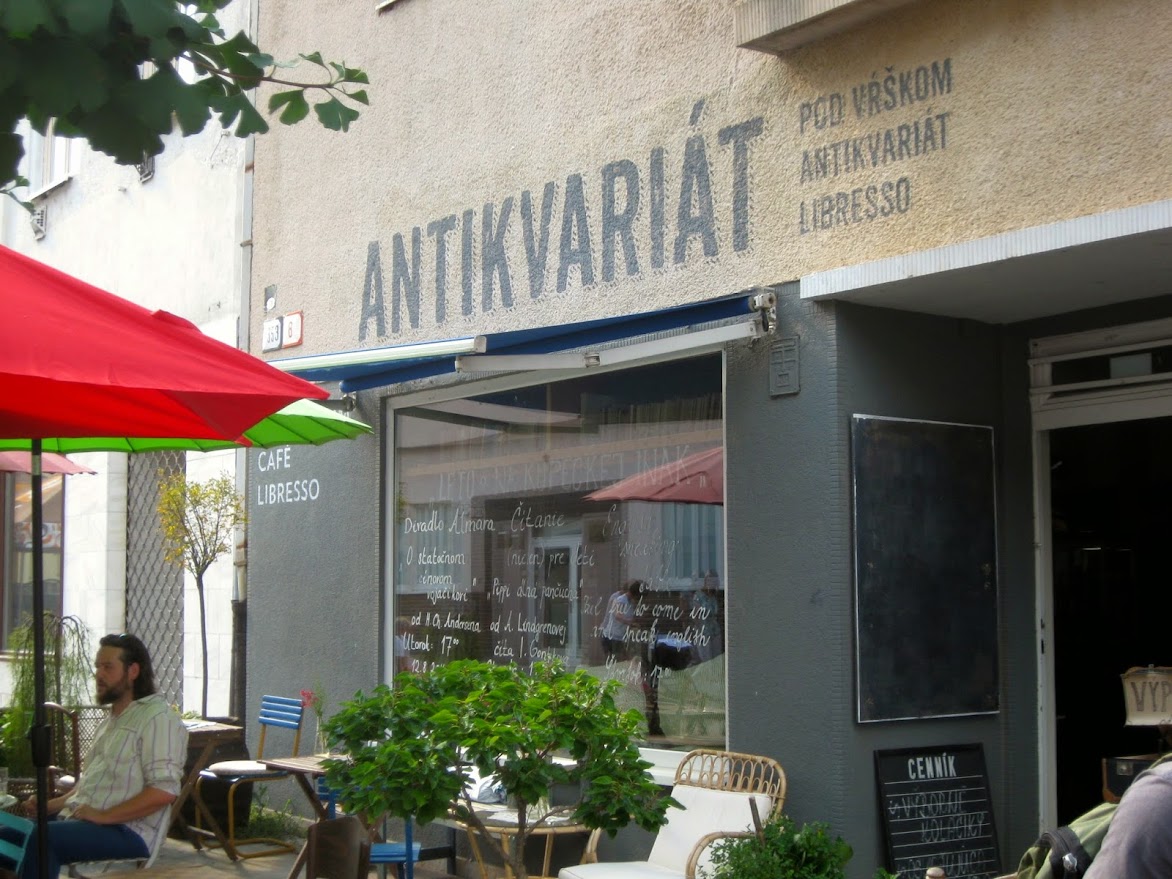 Once back in the "lower" town, we took a break in Antikvariat, a cafe with a cool, appealingly funky Bohemian vibe that's not all that common in this country. With groovy vintage furniture, dusty old books piled up everywhere, and weird modern art on the walls (and ceiling), the place gives off that hip, college-town cafe atmosphere in spades. I savored a refreshingly cold and tasty frappe.