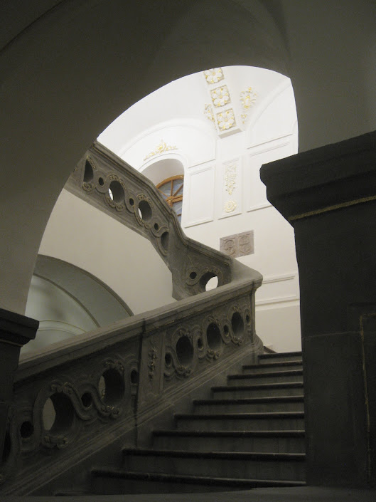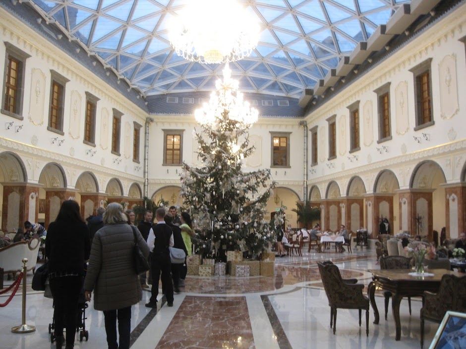 As for the restoration, a massive modern glass dome has been installed over the castle's big central courtyard, which has been turned into a spacious cafe. The hotel has a reportedly good (and sort of pricey) restaurant in a separate (and very Baroque) room off to the right. The upper floors house the hotel's rooms, and I believe the spa is down below (in the former dungeon, perhaps?).