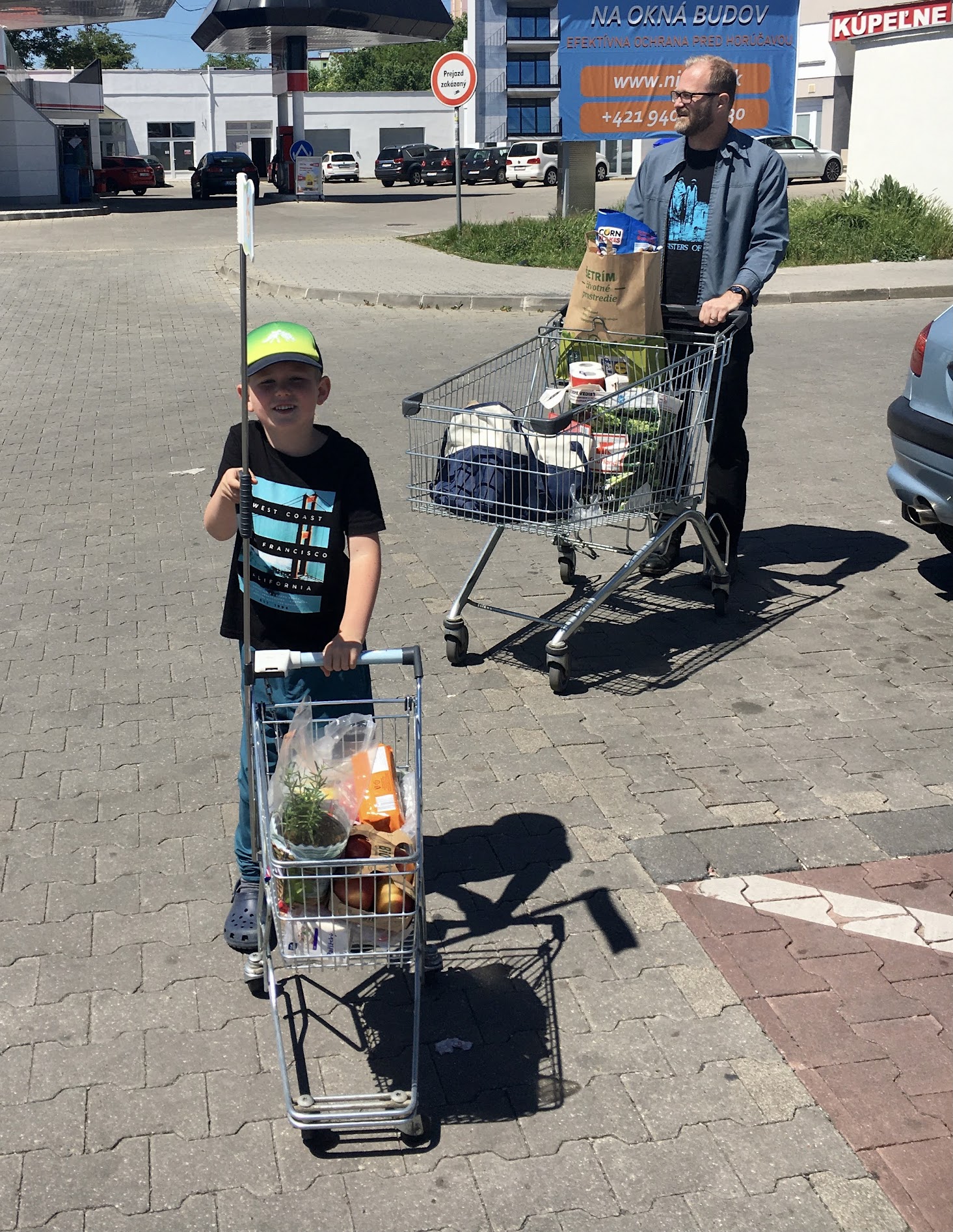 | The grocery shopping chain Lidl has these small shopping carts for little kids. Simon doesn't understand why none of the other grocery stores have them. |