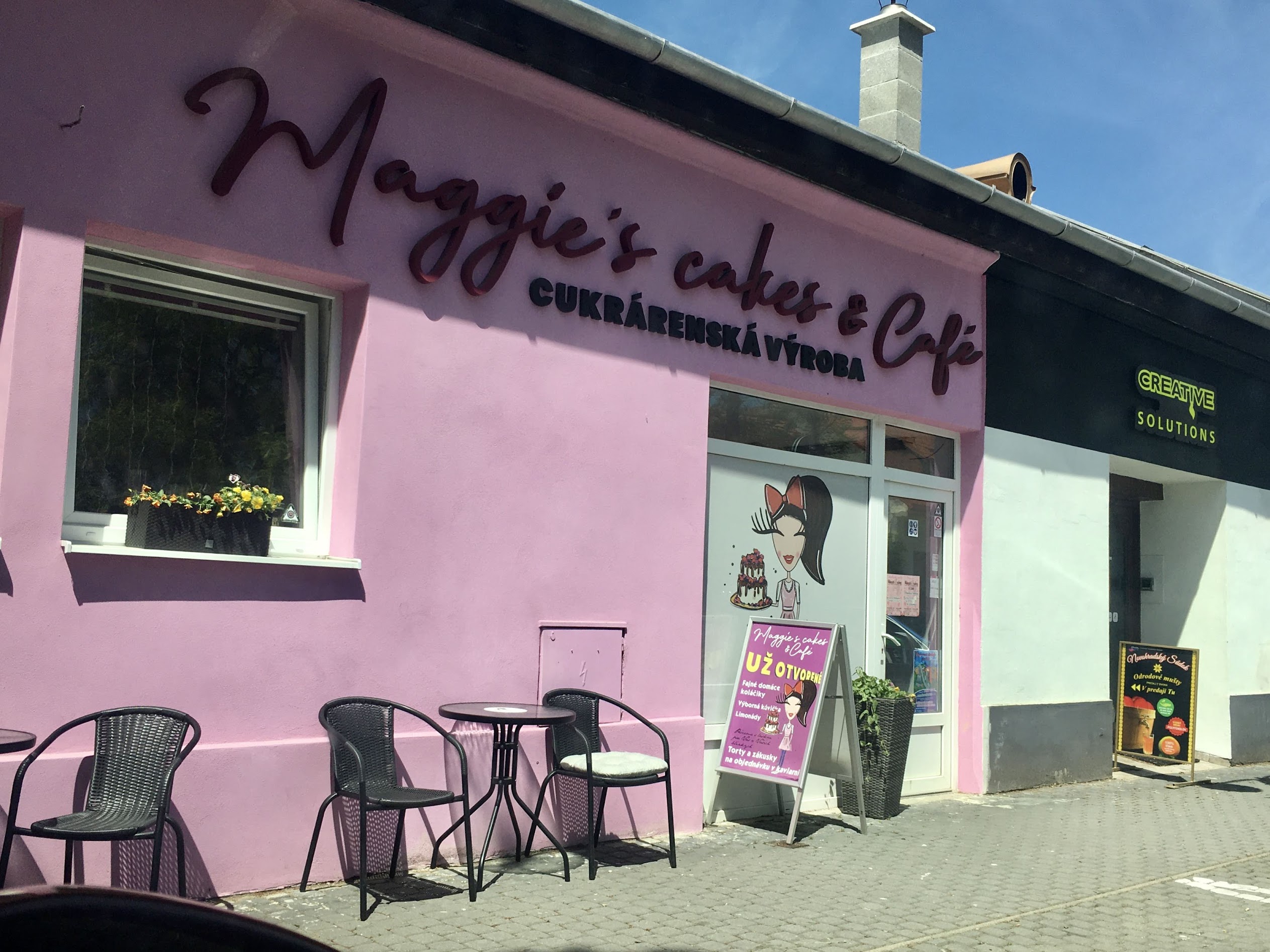 When Terezia was getting a facial from the woman in Lučenec (the one who believes Ukrainian refugees are getting preferential treatment), she mentioned this cukráreň to her to see if she knew about it. The woman said she did, but she claimed to know of an "even better" cukráreň called Maggie's Cakes, across town by the synagogue. So, Terezia and I dutifully checked it out.