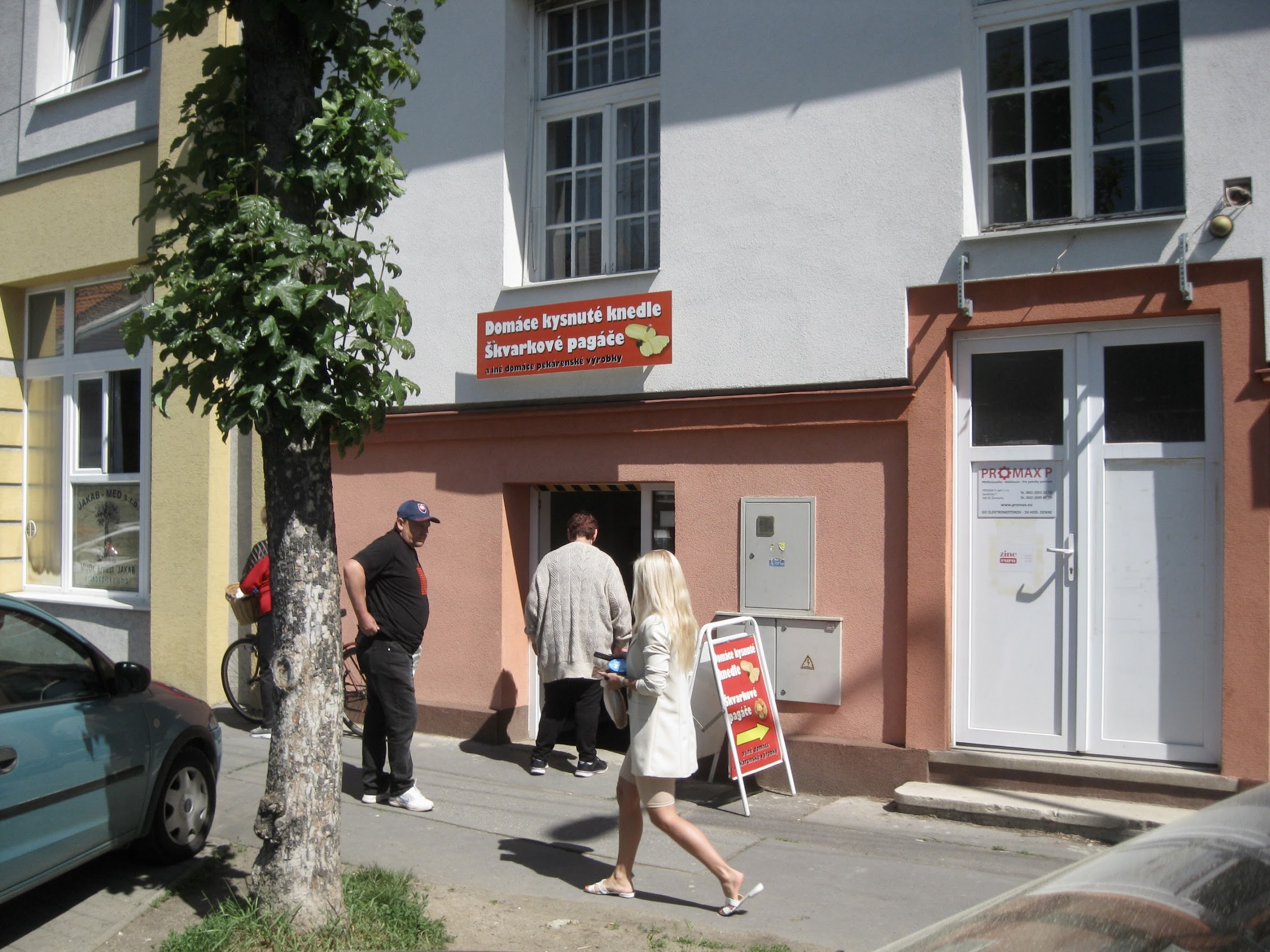 The shop's extremely wordy name is Domáce kysnuté knedle, Škvarkové pagáče, a iné domáce pekárenské výrobky (in English: Homemade yeast dumplings, pork crackling biscuits, and other homemade baked goods), which reads more like a list of offerings than a short, snappy, memorable shop name. (It's also a slightly misleading name in that it refers more to the savory products they sell, even though those are significantly outnumbered by the sweet pastries they offer in their display cases.)