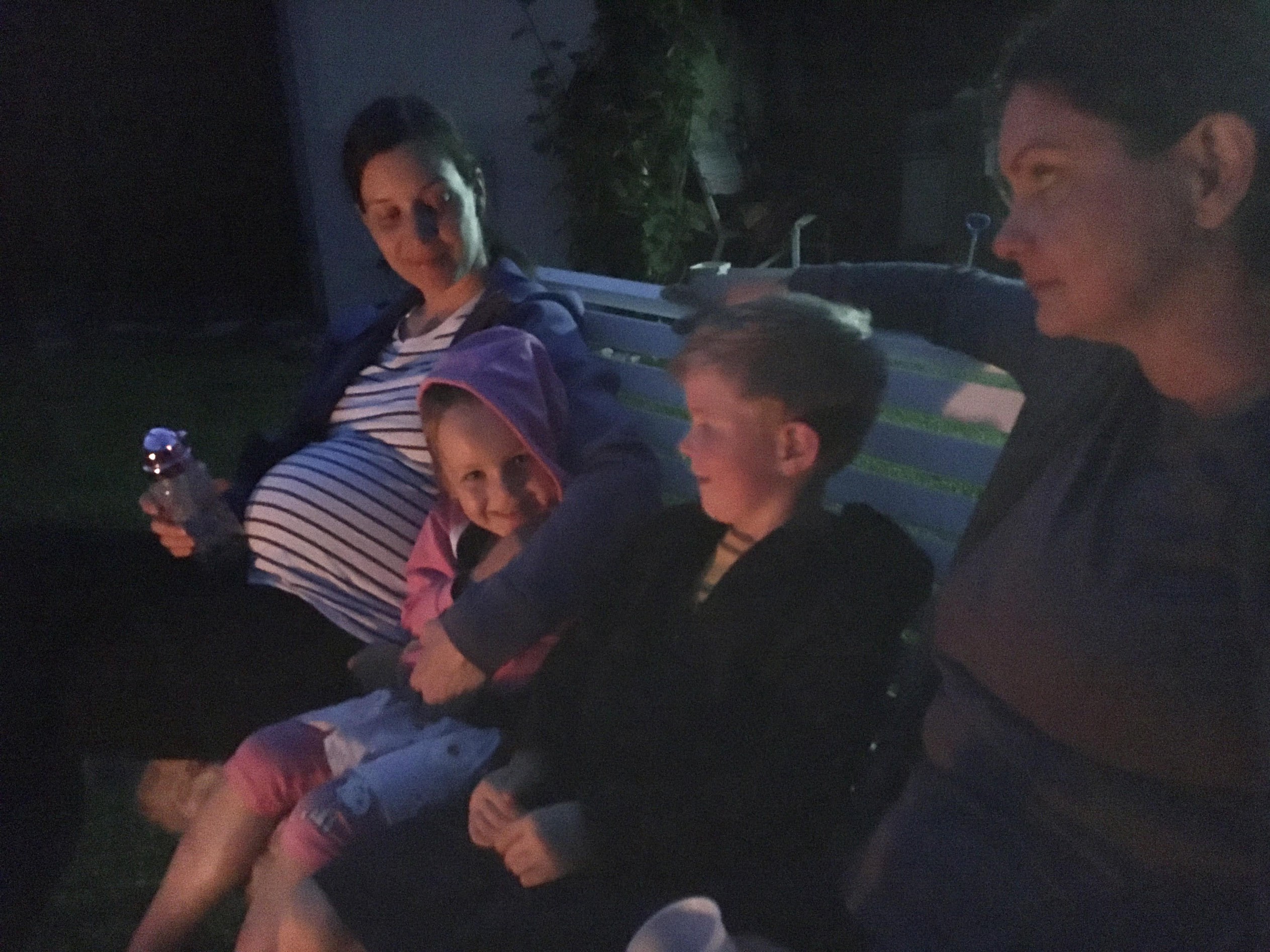 | Sitting around a fire in Terezia's mom's backyard, grilling špekačka (like a fat, short, pork-based hotdog). |