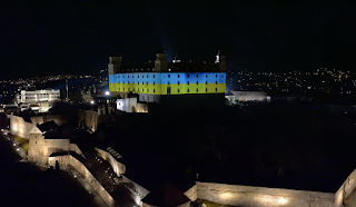 Bratislava's castle lit up in the colors of the Ukrainian flag in late February, shortly after the invasion began. |