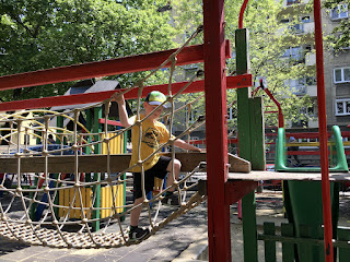 After lunch, Simon perked up quite a bit, so we stopped by the playground in Jakubovo námestie, which features a large, old-school communist-era play structure. Simon spent about 30 minutes climbing all over it and playing with some sand toys. This has to be the biggest play structure we've seen so far in Slovakia. The old-school communist aspect of it is kind of amusing because it lacks many of the safety features that modern-day play structures all tend to have. Simon is old enough and coordinated enough to handle it, but there are definitely some spots that could be problematic for slightly younger and less sure-footed kids, like the shaky bridge that's set at an almost vertical angle so that you have to climb it like a ladder. You can spot the old communist play structures right away because they're often made from wood beams and slats which are painted in the exact same bright primary colors.