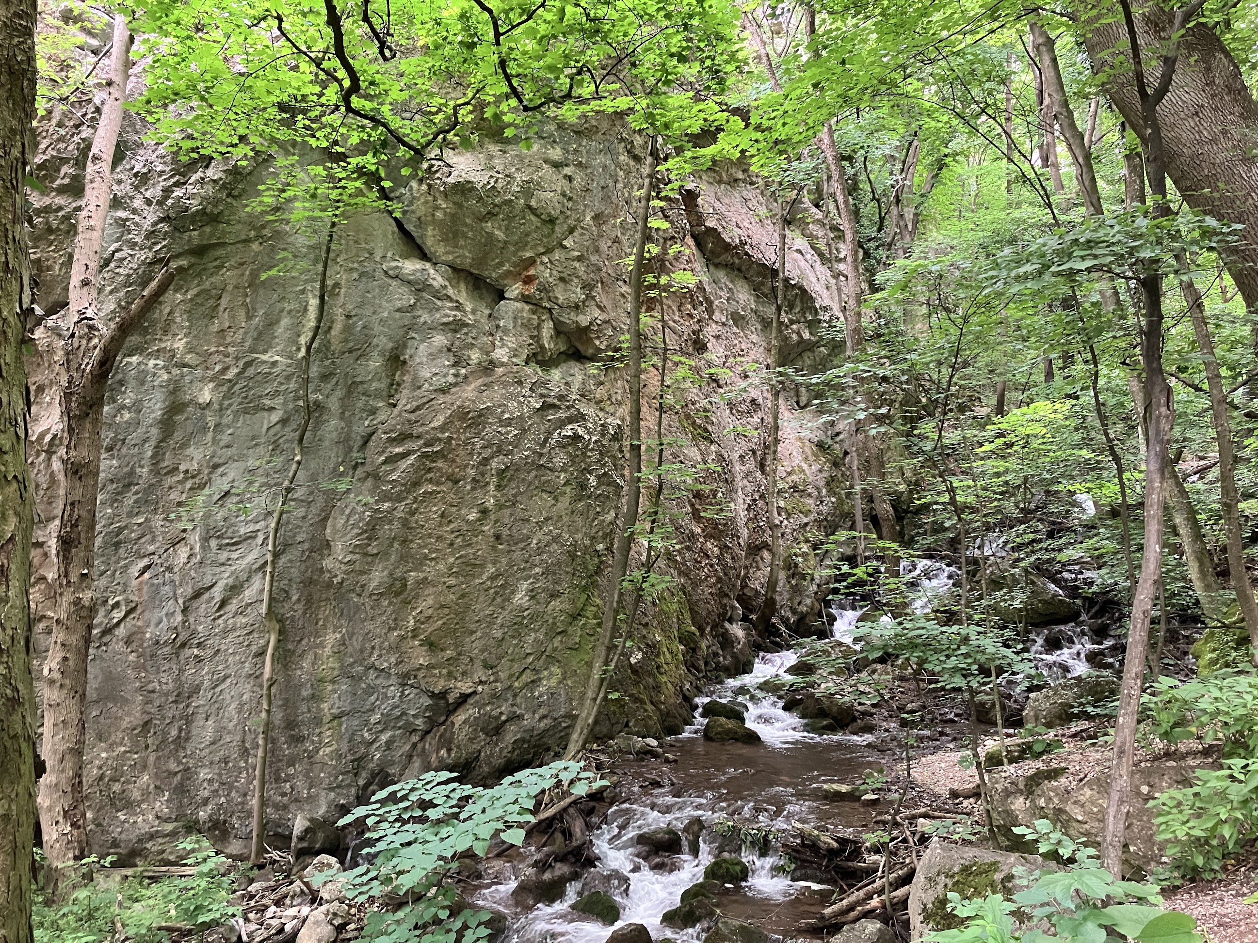The creek, while relatively narrow and rarely ever more than a few feet deep, rushes down the gentle slope in a pretty strong current. It tumbles over its rocky bed in small but forceful cascades, and snakes back and forth, running at several points under small bridges on the hiking path, abrasively carving its way through the rough terrain. The creek was so loud that you sometimes had to raise your voice to be heard over it.