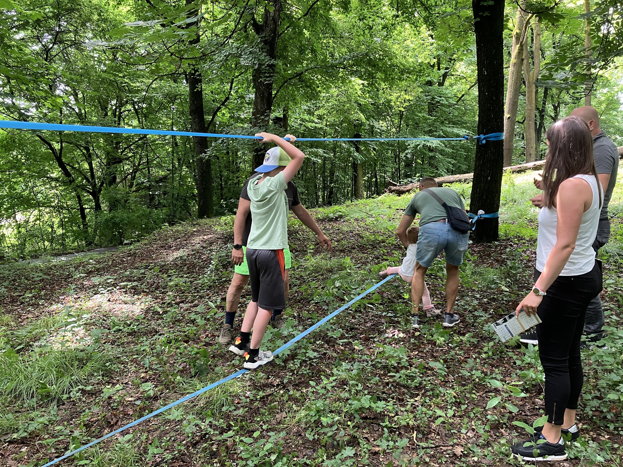 One station had the kids dribbling a soccer ball through an obstacle course of traffic cones and then shooting a goal (which a man squatting down and holding a small goal net would move left or right to ensure each kid actually made a goal). Another station tested the kids' balance by having them walk along ropes stretched tightly between two trees. For another, kids had to match trimmings of local herbs with photos. Another had them hammering nails into logs. Each kid had a card on which they'd receive a stamp after completing each station. Once your kid had 10 stamps, they could get a free ice cream cone, a hot dog, and some random cheap toy. There were also stands serving langoš and beer for the grownups.