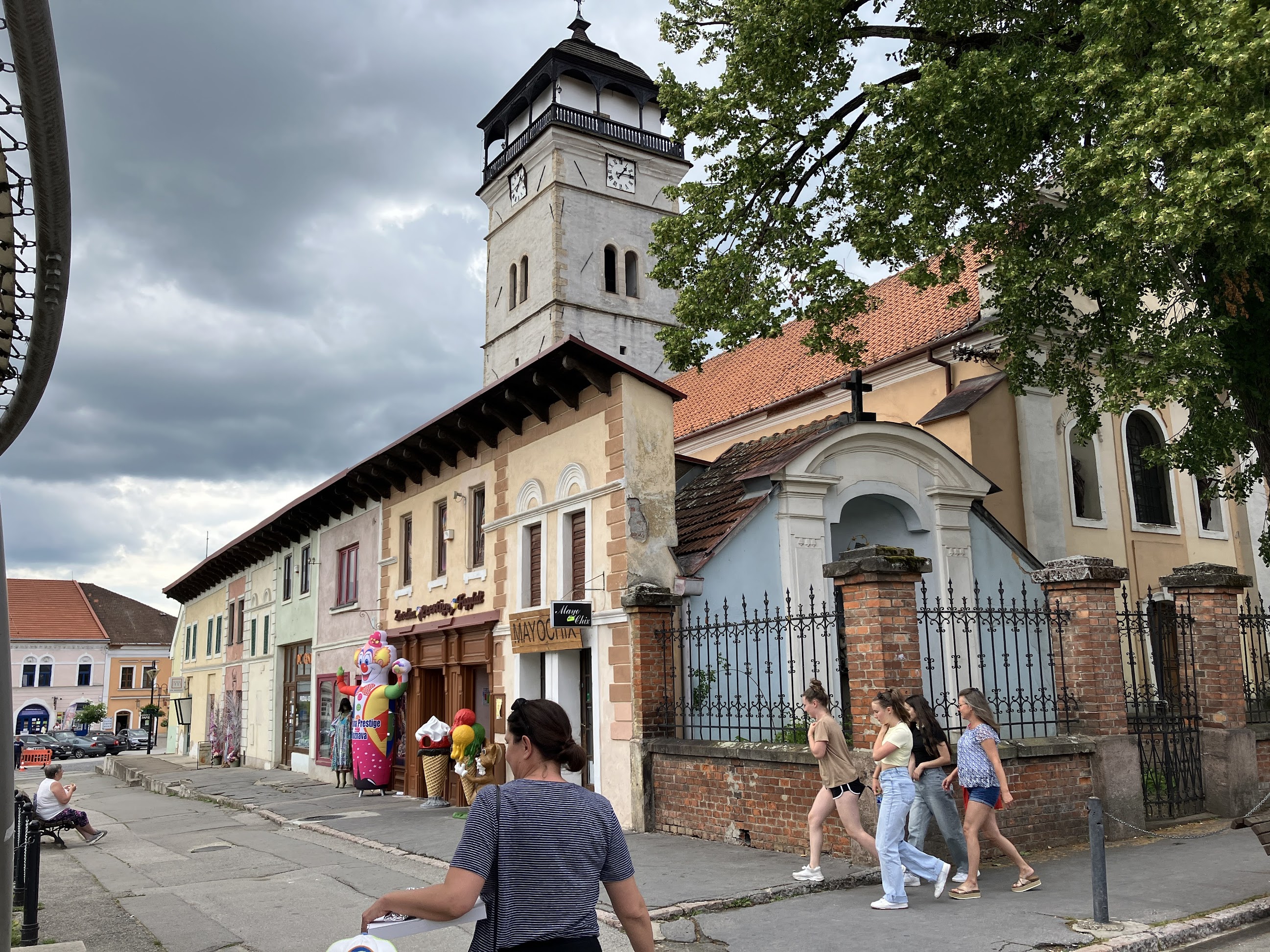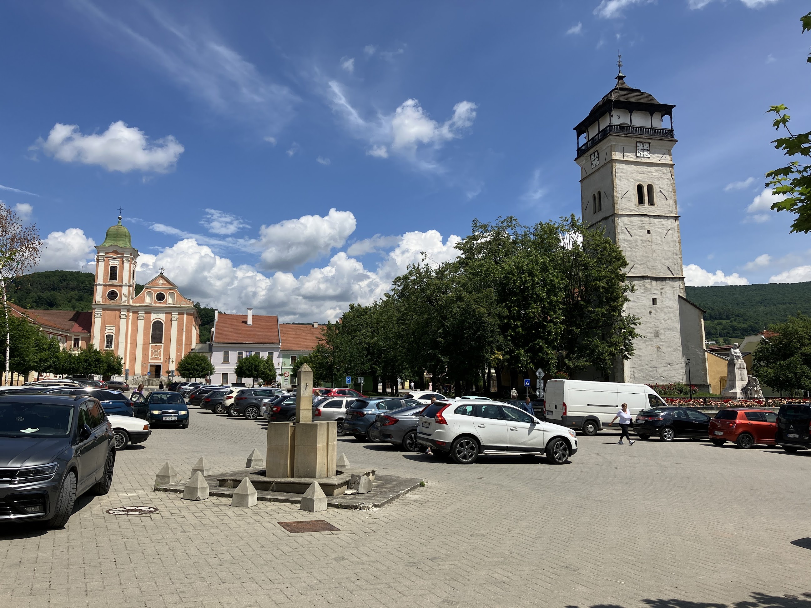Rožňava is a small-ish, sleepy town (population: 16,932 in 2023) with a pretty intact historic center that's cute but certainly not jaw-dropping or anything. There's the aforementioned tower, three attractive old church facades, and numerous other buildings with ornate, colorful medieval facades. However, there's just enough modern signage and streamlined facade renovation, along with bits of clutter (not to mention a significant portion of the vast square's real estate is occupied by a parking lot), to detract from what was probably a nicer square in centuries past.